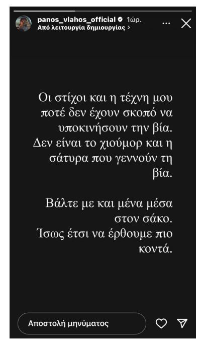 Από την πλευρά του ο Πάνος Βλάχος απάντησε στις αντιδράσεις που προκλήθηκαν για το «Μέσα σε ένα σάκο βάλτε Άδωνι και Πορτοσάλτε» κατά τη διάρκεια live του στη Θεσσαλονίκη με ένα instastory.