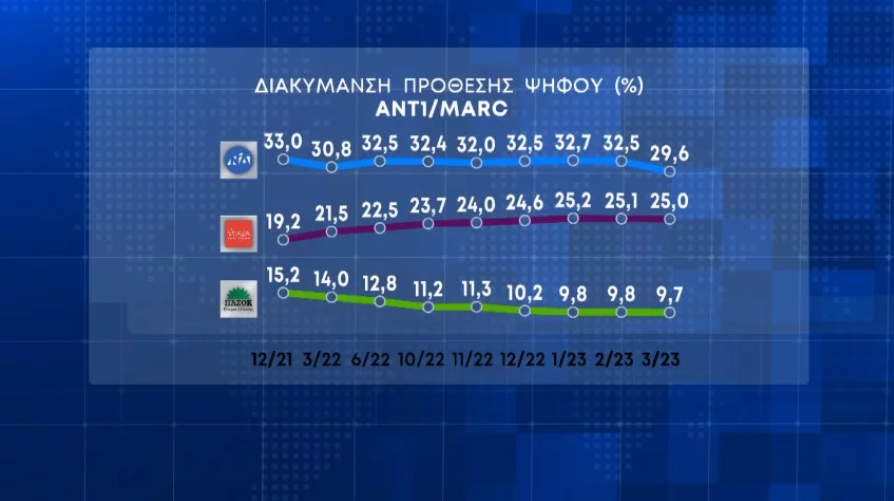 Η Νέα Δημοκρατία προηγείται του ΣΥΡΙΖΑ με 4,6 μονάδες στην πρώτη δημοσκόπηση μετά την τραγωδία στα Τέμπη όπως παρπουσιάστηκε στο κεντρικό δελτίο ειδήσεων του ΑΝΤ1 με τον Νίκο Χατζηνικολάου.