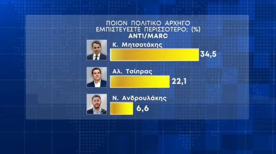 Παράλληλα, το 34,5% των ερωτηθέντων δείχνει να εμπιστεύεται περισσότερο τον κ. Μητσοτάκη, έναντι του 22,1% που απαντά τον Αλέξη Τσίπρα. Ακολουθούν ο Νίκος Ανδρουλάκης με 6,6%, ο Κυριάκος Βελόπουλος με 5,5%, ο Δημήτρης Κουτσούμπας 5,1% και ο Γιάνης Βαρουφάκης με 4,2%.