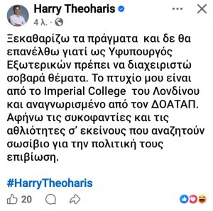 Με μια ξεκάθαρη και αποφασιστική παρέμβαση στα μέσα κοινωνικής δικτύωσης, ο Υφυπουργός Εξωτερικών, Χάρης Θεοχάρης, επέλεξε να απαντήσει στις επιθέσεις που δέχτηκε το τελευταίο διάστημα, βάζοντας οριστικό τέλος στη σχετική παραφιλολογία. Ο κ. Θεοχάρης, με τη σοβαρότητα που επιβάλλει το θεσμικό του αξίωμα, ξεκαθάρισε το τοπίο όσον αφορά τους τίτλους σπουδών του, αρνούμενος να επιτρέψει τη συνέχιση μιας άδικης στοχοποίησης.