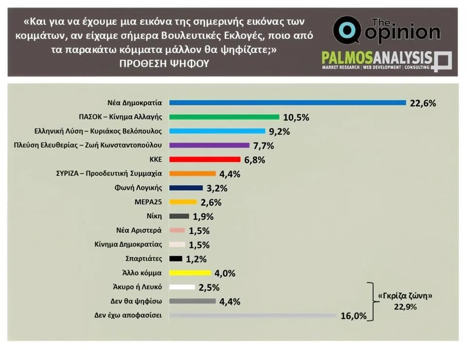 Όσον αφορά την πρόθεση ψήφου, η ΝΔ συγκεντρώνει 22,6%, ακολουθούμενη από το ΠΑΣΟΚ με 10,5%, την Ελληνική Λύση με 9,2%, την Πλεύση Ελευθερίας με 7,7%, το ΚΚΕ με 6,8%, τον ΣΥΡΙΖΑ με 4,4%, τη Φωνή Λογικής με 3,2%, το ΜέΡΑ25 με 2,6%, τη Νίκη με 1,9% και Νέα Αριστερά – Κίνημα Δημοκρατίας με 1,5%.