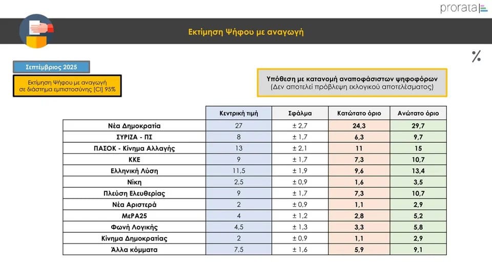 Στην εκτίμηση της ψήφου, η ΝΔ συγκεντρώνει 27%, το ΠΑΣΟΚ 13%, η Ελληνική Λύση 11,5%, η Πλεύση Ελευθερίας και το ΚΚΕ 9%, ο ΣΥΡΙΖΑ-ΠΣ 8%, η Φωνή Λογικής 4,5%, το ΜεΡΑ25 4%.