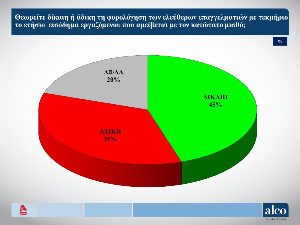 Τέλος, στο ερώτημα για τη φορολόγηση των ελεύθερων επαγγελματιών με τεκμήριο το ετήσιο εισόδημα εργαζομένου που αμείβεται με τον κατώτατο μισθό, το 45% τη θεωρούν δίκαιη και το 35% άδικη.