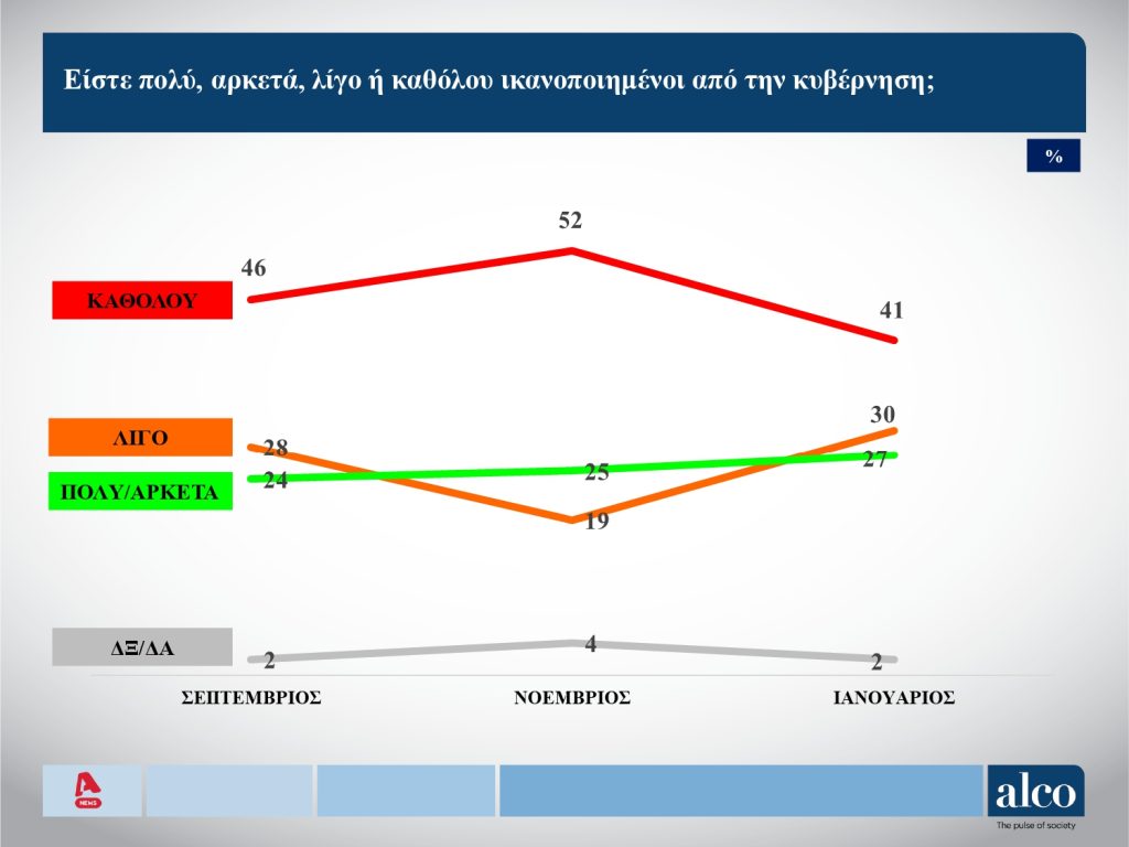 Στην ίδια δημοσκόπηση, που παρουσιάστηκε στο κεντρικό δελτίο ειδήσεων του Alpha, το 41% δηλώνουν καθόλου ικανοποιημένοι από την κυβέρνηση, το 30% λίγο και το 27% πολύ/ αρκετά.