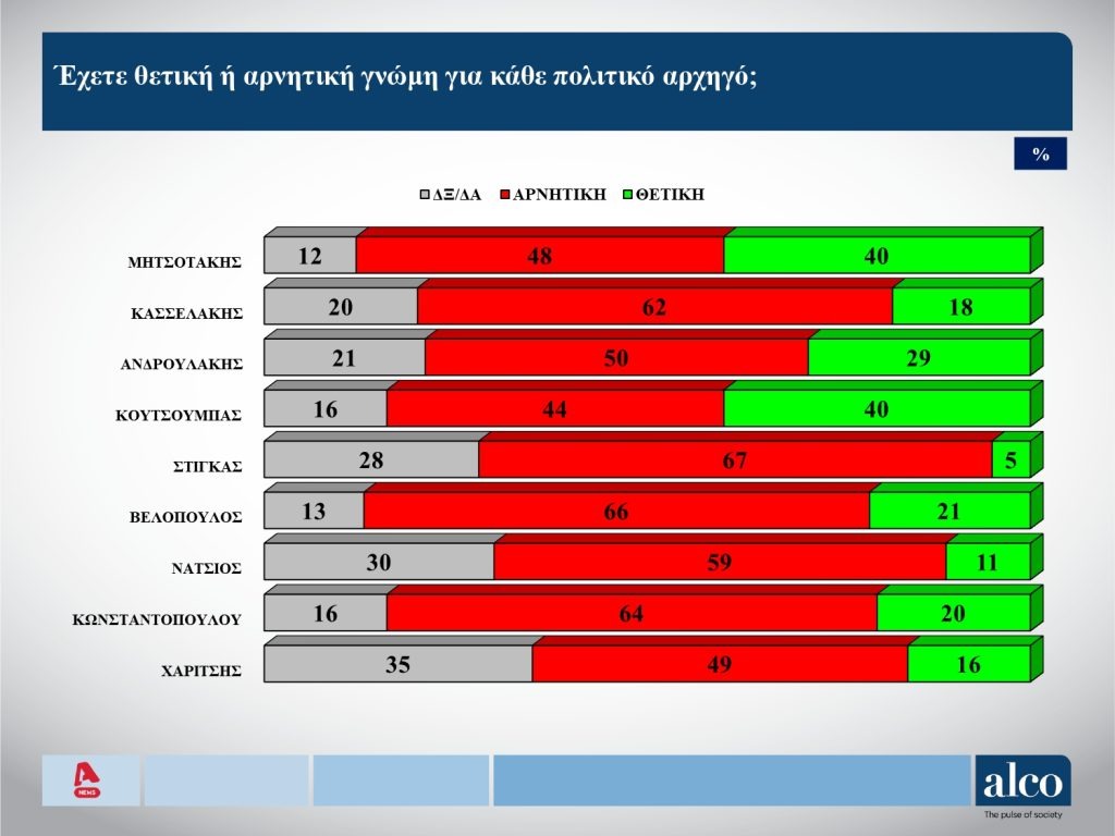Στο ερώτημα «έχετε θετική ή αρνητική άποψη για κάθε πολιτικό αρχηγό», το 62% απάντησε ότι έχει αρνητική άποψη για τον κ. Κασσελάκη, με το 20% να απαντά «δεν ξέρω / δεν απαντώ» και μόλις το 18% να λέει ότι έχει θετική γνώμη για εκείνον.