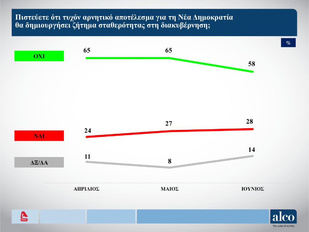 Όπως προέκυψε από τα ευρήματα της δημοσκόπησης της Alco για τον Alpha το κυβερνών κόμμα συγκεντρώνει ενα ποσοστό μεταξύ 29,5% και 33,9%, ενώ η αξιωματική αντιπολίτευση λαμβάνει ποσοστό ανάμεσα σε 14,6% και 17,8%.