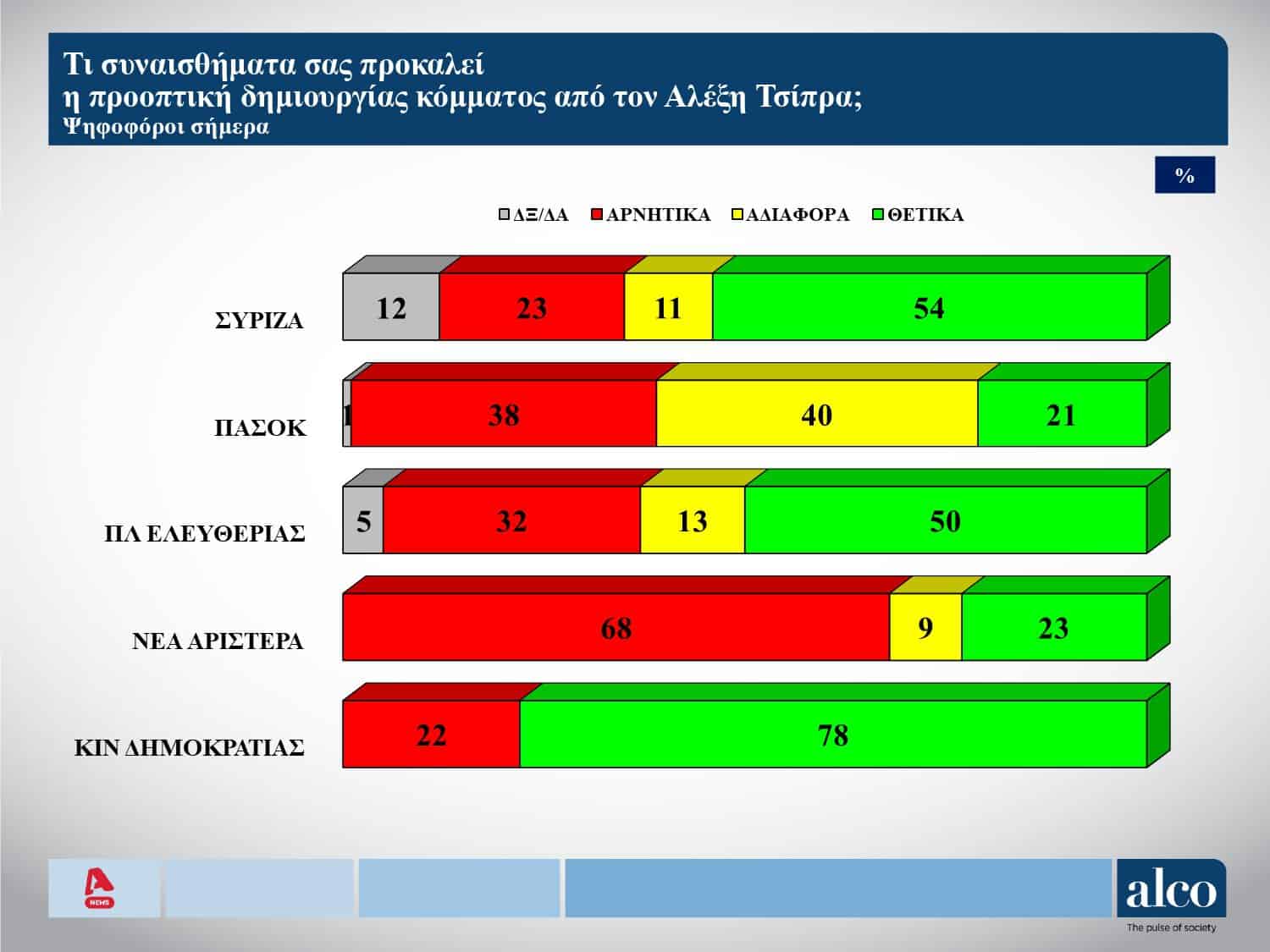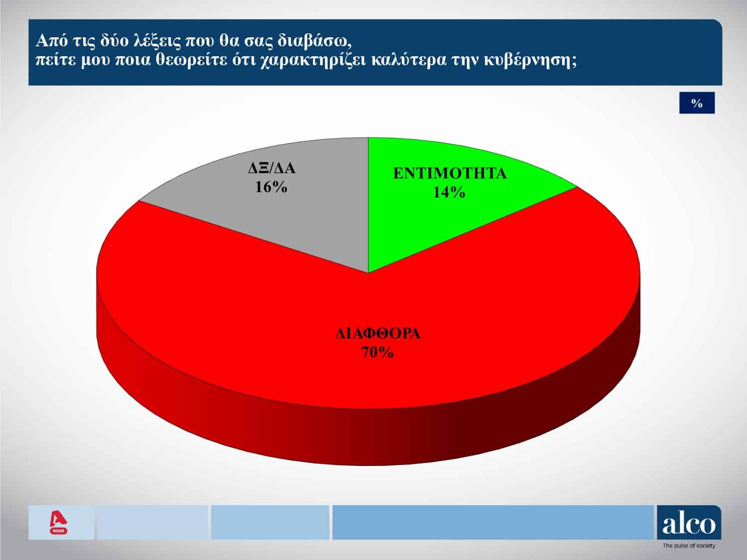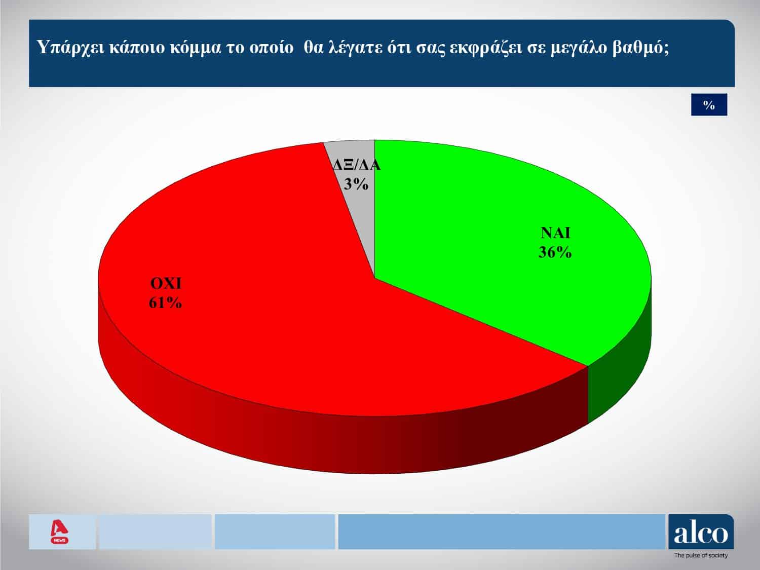 Στις 12,5 μονάδες προσδιορίζει η Alco το προβάδισμα της Νέας Δημοκρατίας στην πρόθεση ψήφου επί των εγκύρων, σύμφωνα με τη δημοσκόπηση που παρουσιάστηκε στο κεντρικό δελτίο του Alpha το βράδυ της Δευτέρας (29/9). Το ΠΑΣΟΚ βρίσκεται στη δεύτερη θέση, καταγράφοντας άνοδο 0,8 μονάδων σε σχέση με τη μέτρηση του Ιουνίου από την ίδια εταιρεία.