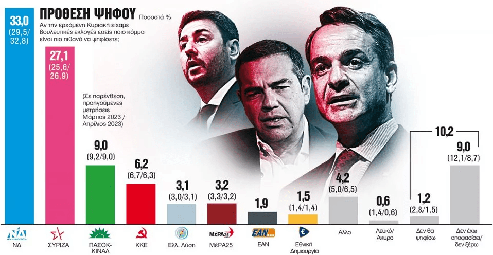 Δημοσκόπηση της GPO για την εφημερίδα για «ΤΑ ΝΕΑ Σαββατοκύριακο» δίνει προβάδισμα στη ΝΔ 5,9 μονάδων έναντι του ΣΥΡΙΖΑ στην πρόθεση ψήφου, δύο εβδομάδες πριν τις κάλπες της 21ης Μαΐου.