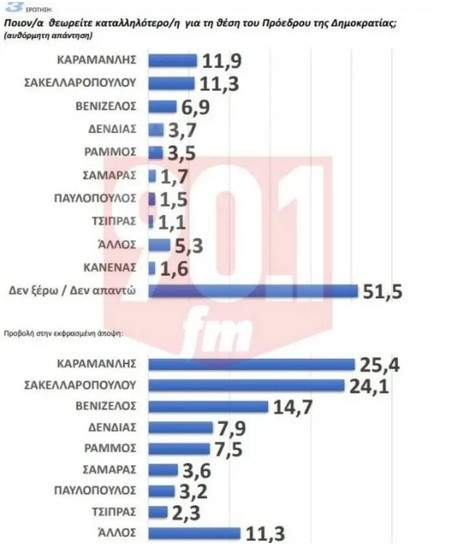 Στη δεύτερη θέση βρίσκεται η εν ενεργεία Πρόεδρος κ. Σακελλαροπούλου με 11,3% και 24,1% αντίστοιχα, τρίτος ο κ. Βενιζέλος με 6,9 % και 14,7% ενώ την πρώτη πεντάδα ολοκληρώνουν ο νυν Υπουργός Εθνικής Άμυνας κ. Δένδιας που επίσης έχει δηλώσει ότι δεν ενδιαφέρεται για τη θέση και η πολιτική πρόταση της Νέας Αριστεράς κ. Ράμμος.