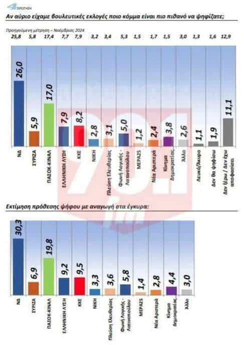 Στην εκτίμηση ψήφο, τα κόμματα λαμβάνουν: Με βάση τα στοιχεία, μετά τη Νέα Δημοκρατία, που προηγείται του ΠΑΣΟΚ – Κινήματος Αλλαγής με διαφορά μεγαλύτερη των 10 ποσοστιαίων μονάδων (30,3% έναντι 19,8%, στην τρίτη θέση εμφανίζεται το ΚΚΕ με 9,8% και στην τέταρτη η Ελληνική Λύση του Κυριάκου Βελόπουλου με 9,5%.