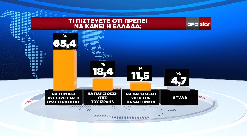 Από την άλλη στο ερώτημα τι πρέπει να κάνει η στον πόλεμο στη Μέση Ανατολή το 65,4% απάντησε ότι η Ελλάδα πρέπει να στηρίξει στάση ουδετερότητας.
