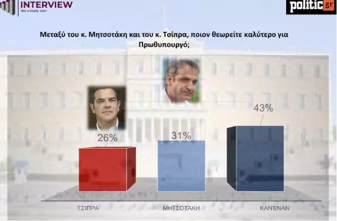 Ενδιαφέρον παρουσιάζει η ερώτηση για το ποιον θεωρείται καταλληλότερο για πρωθυπουργός αφού τα δύο ονόματα που παρουσιάζονται είναι του Κυριάκου Μητσοτάκη και του Αλέξη Τσίπρα. Συγκεκριμένα, ο κ. Μητσοτάκης συγκεντρώνει 31% ενώ ο Αλέξης Τσίπρας είναι σε απόσταση αναπνοής στο 26%. Ωστόσο το υψηλότερο ποσοστό συγκεντρώνει η απάντηση «κανένας», που εκτοξεύεται στο 43%.