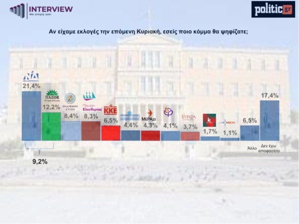 Προβάδισμα 11,1 ποσοστιαίων μονάδων διατηρεί η Νέα Δημοκρατία έναντι του ΠΑΣΟΚ-ΚΙΝΑΛ, σύμφωνα με νέα δημοσκόπηση της εταιρείας Interview για λογαριασμό του politic.gr.