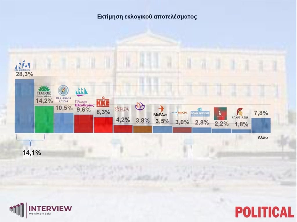 Πρωτιά με ποσοστό 28,3% καταλαμβάνει η ΝΔ όπως αποτυπώνεται στη νέα δημοσκόπηση της Interview για λογαριασμό της εφημερίδας Political, με το ΠΑΣΟΚ να βρίσκεται στη δεύτερη θέση, αφήνοντας την Πλεύση Ελευθερίας τέταρτη.