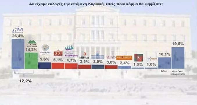 Στην έρευνα, η οποία διενεργήθηκε το διάστημα από 1ης/4/2026 έως 6/4/2026 και στην ερώτηση «αν είχαμε εκλογές την επόμενη Κυριακή, ποιο κόμμα θα ψηφίζατε;», το 26,4% απαντά τη ΝΔ, το 14,2% το ΠΑΣΟΚ, το 5,6% την Ελληνική Λύση, το 5,1% το ΚΚΕ, το 4,7% την Πλεύση Ελευθερίας, το 3,5% το ΜέΡΑ25, το 3,5% τη Φωνή Λογικής, το 3% τον ΣΥΡΙΖΑ, το 2,4% τους Δημοκράτες, το 1% τη Νέα Αριστερά, το 1% τη Νίκη, το 10,1% άλλο και το 19,5% «δεν έχω αποφασίσει».