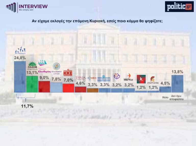 Πρώτη και με διψήφιο προβάδισμα παραμένει η Νέα Δημοκρατία, ενώ στη δεύτερη θέση βρίσκεται στο ΠΑΣΟΚ και στην τρίτη η Πλεύση Ελευθερίας, στη δημοσκόπηση της Interview.