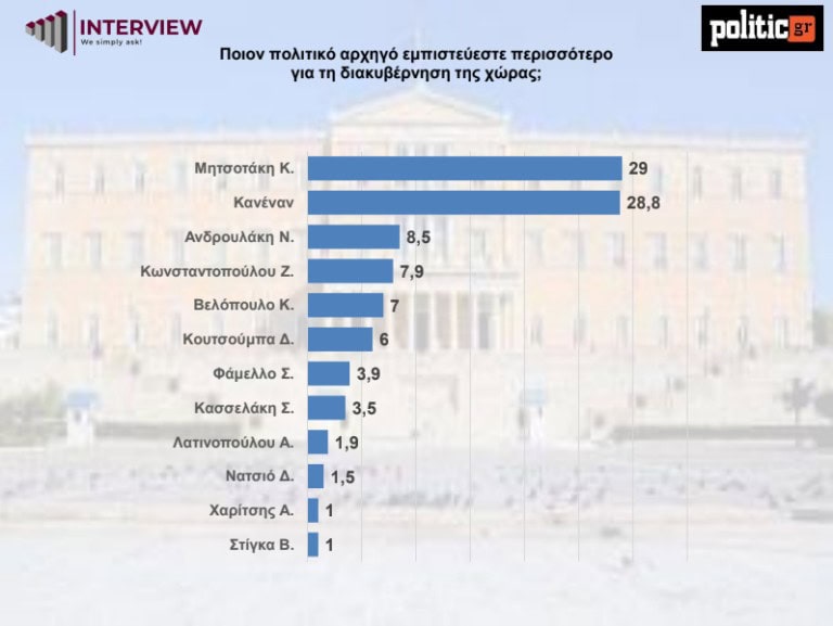 Την ίδια ώρα, όμως, ο Κυριάκος Μητσοτάκης καταγράφει ποσοστό εμπιστοσύνης 29% -υψηλότερο από κάθε άλλον πολιτικό αρχηγό-, ενώ ακριβώς δίπλα του βρίσκεται το «κανένας» με 28,8%, καταγράφοντας με τον τρόπο αυτό την αδυναμία του πολιτικού συστήματος να προσφέρει πειστικές εναλλακτικές.