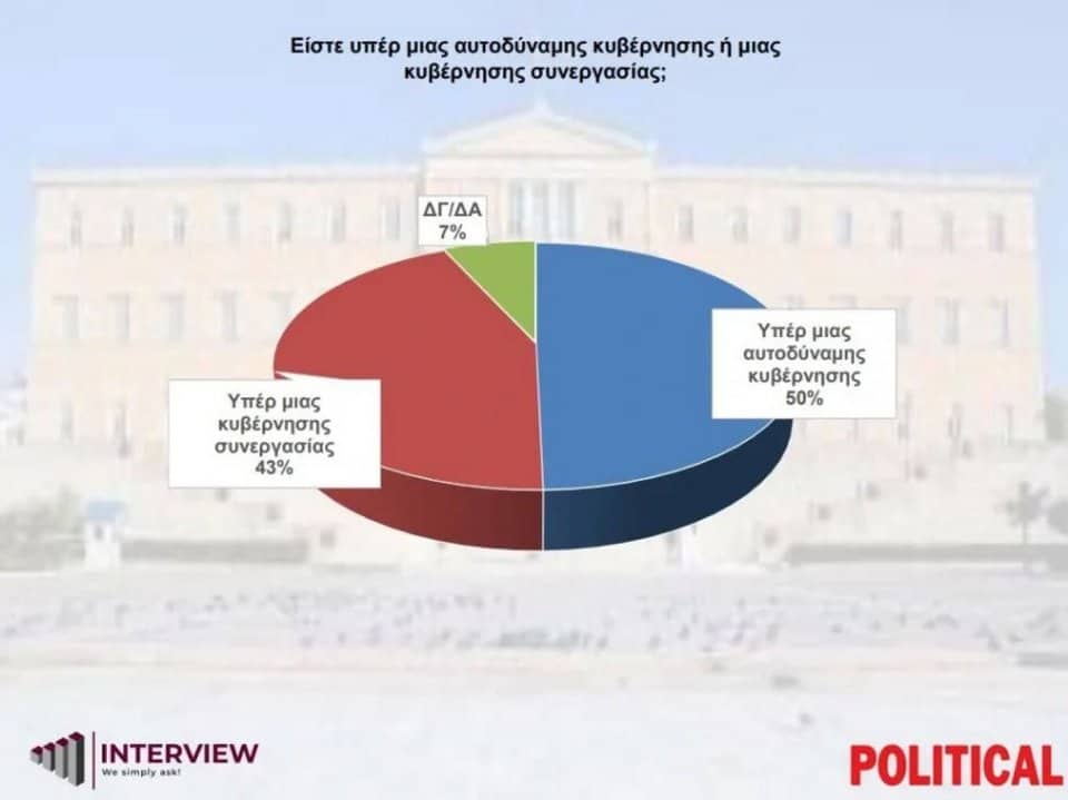 Στην ίδια δημοσκόπηση οι συμμετέχοντες κλήθηκαν να απαντήσουν αν θέλουν μια αυτοδύναμη κυβέρνηση ή μια κυβέρνηση συνεργασίας, με το 50% να τάσσεται υπέρ της πρώτης λύσης και το 43% να επιθυμεί τη δεύτερη.