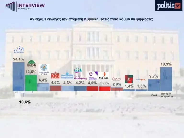 Την υπεροχή της Νέας Δημοκρατίας καταγράφει νέα δημοσκόπηση, αυτή τη φορά της Interview, έναντι του δεύτερου ΠΑΣΟΚ.
