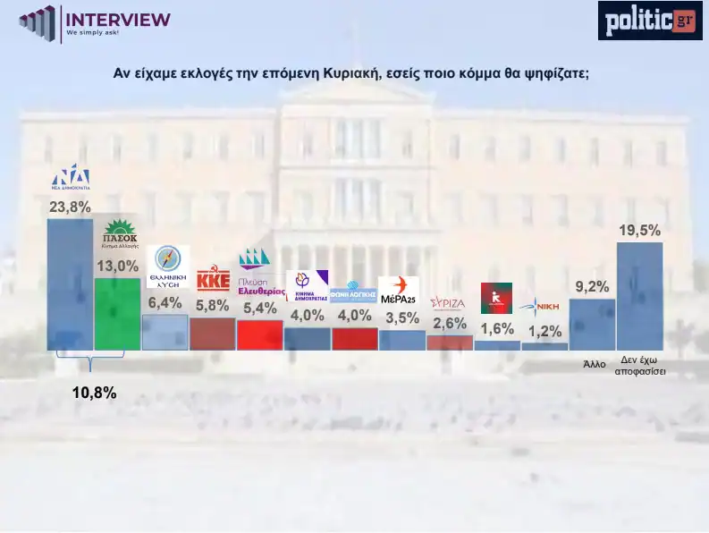 Σταθερά πρώτο κόμμα παραμένει η Νέα Δημοκρατία, σύμφωνα με τη νέα δημοσκόπηση της εταιρείας Interview για λογαριασμό του politic.gr καταγράφοντας διαφορά 10,8 μονάδων από το ΠΑΣΟΚ.