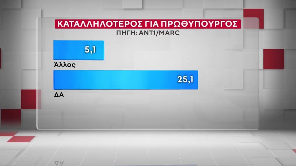 Στην ερώτηση για τον καταλληλότερο για πρωθυπουργό, οι πολίτες που ρωτήθηκαν στο πλαίσιο της δημοσκόπησης της MARC, απάντησαν σε ποσοστό 30,6% ότι είναι ο Κυριάκος Μητσοτάκης. Το 8.5% στηρίζει την Ζωή Κωνσταντοπούλου ενώ το 7,3% τον Νίκο Ανδρουλάκη.