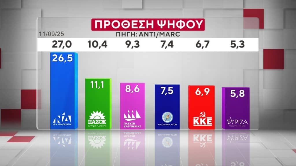 Στην πρόθεση ψήφου, η ΝΔ συγκεντρώνει το 26,5%, το ΠΑΣΟΚ 11,1%, η Πλεύση Ελευθερίας 8,6%, η Ελληνική Λύση 7,5%, το ΚΚΕ 6,9% και ο ΣΥΡΙΖΑ 5,8%.