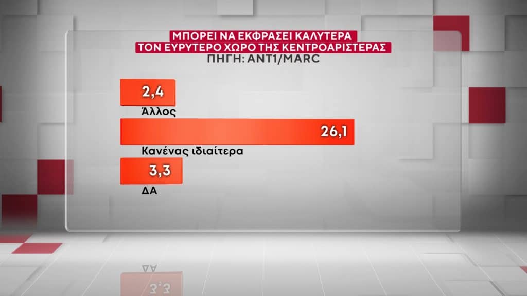 Για το ποιος μπορεί να εκφράσει καλύτερα τον ευρύτερο χώρο της Κεντροαριστερας, οι πολίτες απάντησαν Αλέξης Τσίπρας σε ποσοστό 24%. Ακολουθεί η Ζωή Κωνσταντοπούλου με 12,8%, ο Νίκος Ανδρουλάκης με 12,6% και ο Σωκράτης Φάμελλος με 6,6%