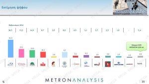 Η Νέα Δημοκρατία παρά τις απώλειες που υπάρχουν εξακολουθεί να έχει την απόλυτη κυριαρχία στο πολιτικό σκηνικό καθώς προηγείται με 16,3 μονάδες του δεύτερου ΣΥΡΙΖΑ ενώ το ΠΑΣΟΚ πέρασε στην τρίτη θέση σύμφωνα με την δημοσκόπηση της Metron Analysis για το MEGA.
