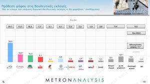 Απόλυτη κυριαρχία της Νέας Δημοκρατίας στο πολιτικό σκηνικό της χώρας δείχνει και η αποψινή δημοσκόπηση της Metron Analysis που παρουσιάστηκε στο κεντρικό δελτίο ειδήσεων του MEGA. Η ΝΔ προηγείται στην πρόθση ψήφου με 38% κι ακολουθεί ο ΣΥΡΙΖΑ με 15,2%. Tο ΠΑΣΟΚ είναι τρίτο με 10,6% και το ΚΚΕ με 8,1%.