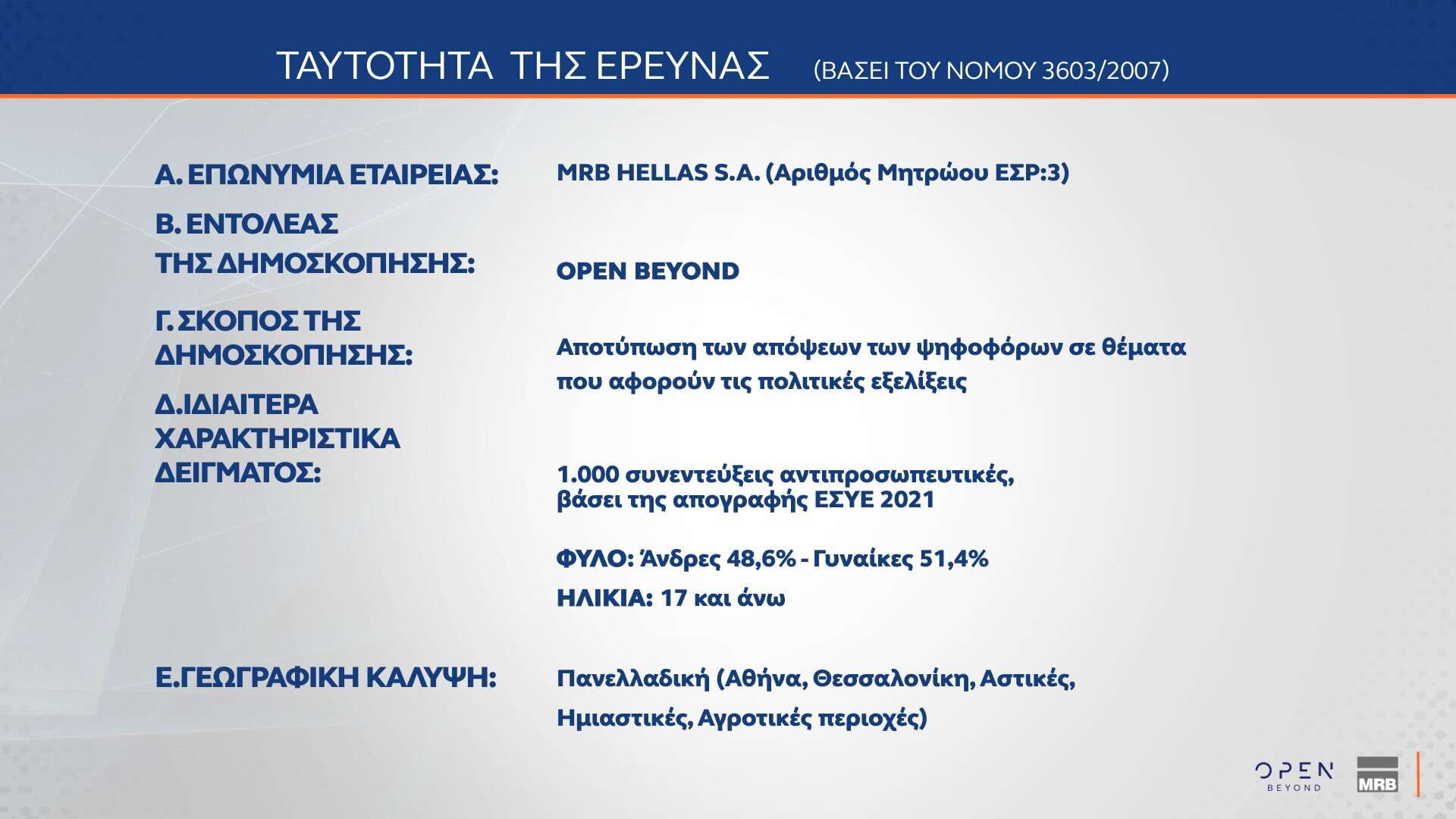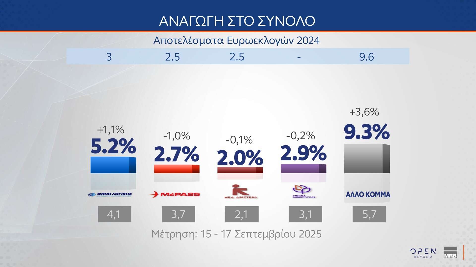 Σταθερό προβάδισμα καταγράφει η Νέα Δημοκρατία στη νέα δημοσκόπηση της MRB για λογαριασμό του τηλεοπτικού σταθμού Open, η οποία διεξήχθη το διάστημα 13–15 Οκτωβρίου 2025. Στην εκτίμηση ψήφου, η ΝΔ συγκεντρώνει 28%, με το ΠΑΣΟΚ να ακολουθεί με 13,8%, την Ελληνική Λύση με 12,1%, την Πλεύση Ελευθερίας με 9,4%, το ΚΚΕ με 8,6%, τον ΣΥΡΙΖΑ με 4,3%, τη Φωνή Λογικής με 5,2%, το Κίνημα Δημοκρατίας με 2,9%, το ΜέΡΑ25 με 2,7%, τη Νέα Αριστερά με 2% και τη Νίκη με 1,7%. Παρατηρείται αύξηση 3,6% στην επιλογή «άλλο κόμμα».