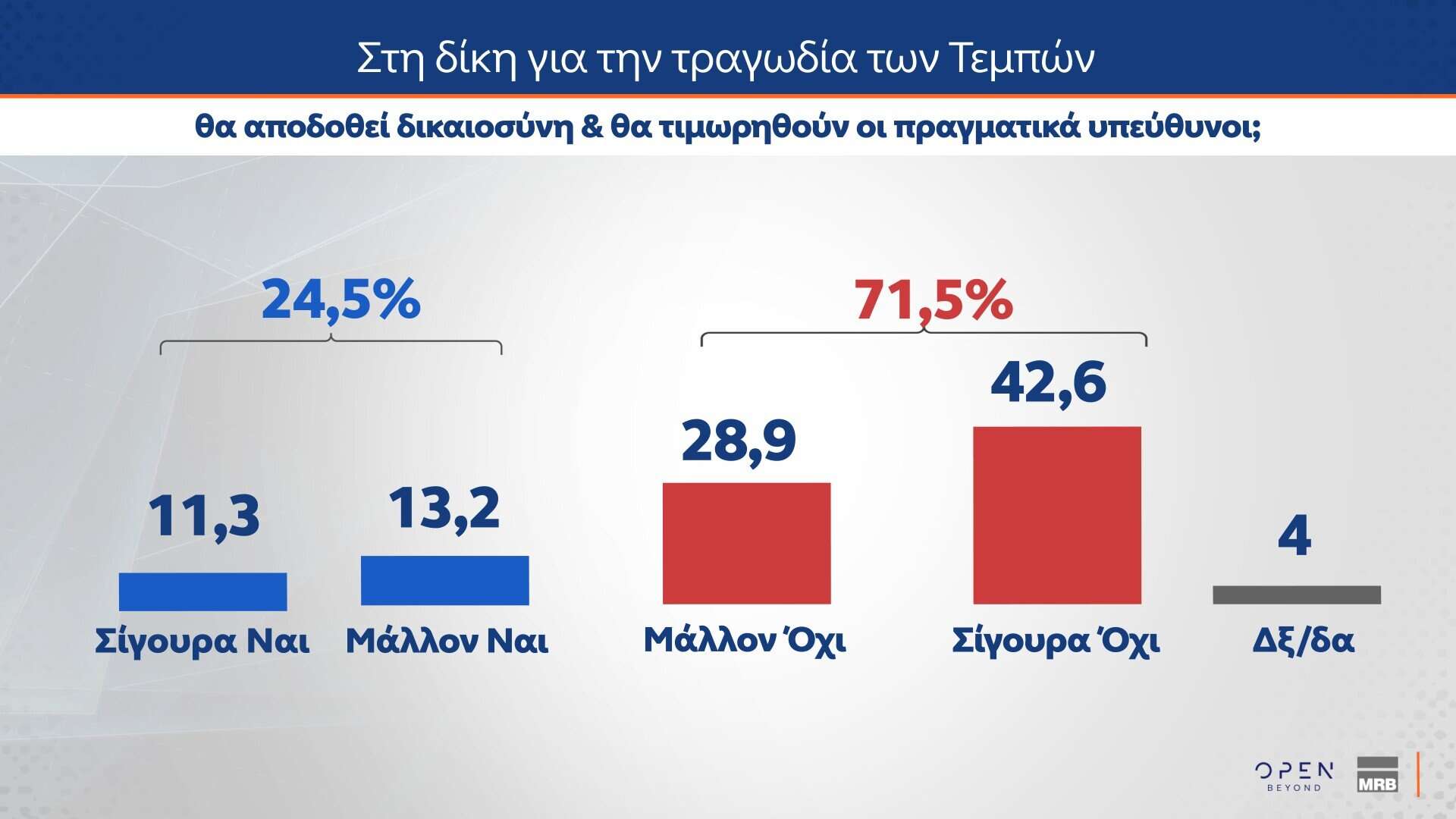 Σχετικά με τις εκδηλώσεις διαμαρτυρίας μπροστά από το Μνημείο του Άγνωστου Στρατιώτη, το 59% τάσσεται υπέρ, ενώ το 32,9% εκφράζει αντίθεση. Στην ερώτηση για τη δίκη της τραγωδίας των Τεμπών, το 71,5% δηλώνει ότι δεν πιστεύει πως θα τιμωρηθούν οι πραγματικά υπεύθυνοι.