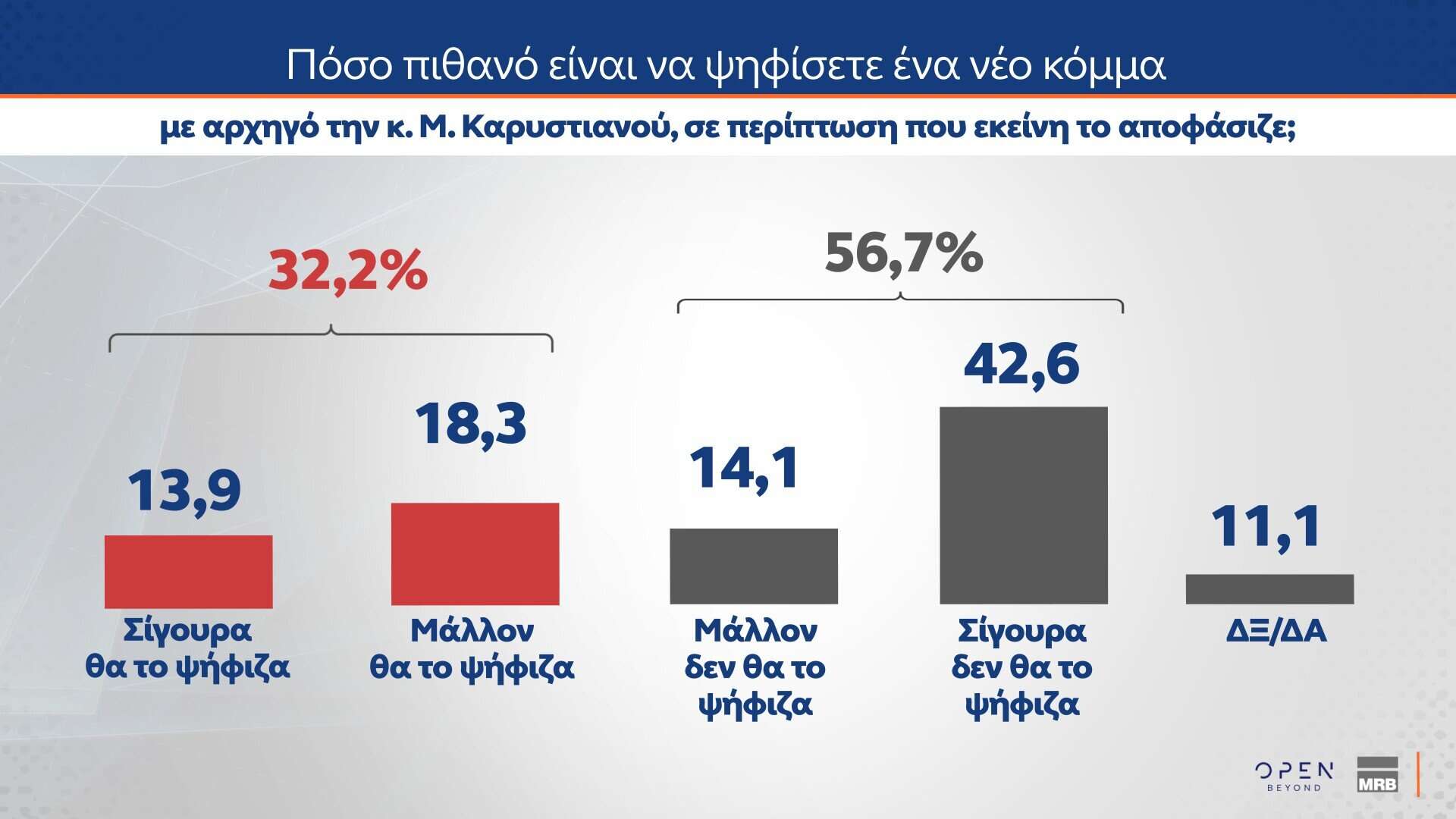 Η Μαρία Καρυστιανού συγκεντρώνει 50% θετικές γνώμες, ωστόσο το 51,1% θεωρεί ότι δεν πρέπει να ασχοληθεί με την πολιτική. Αν ιδρύσει κόμμα, το 32,2% δηλώνει ότι μάλλον ή σίγουρα θα το ψήφιζε, ενώ το 56,7% εμφανίζεται αρνητικό.