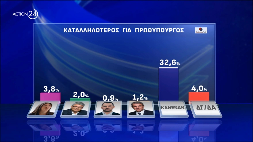 Την απόλυτη κυριαρχία της ΝΔ και του Κυριάκου Μητσοτάκη στο πολιτικό σκηνικό και την τρελή πτήση της Νέας Δημοκρατίας προς τον θρίαμβο στις ευρωεκλογές αποτύπωσε και η σημερινή δημοσκόπηση της Opinion Poll που παρουσιάστηκε στο κεντρικό δελτίο του Action 24.