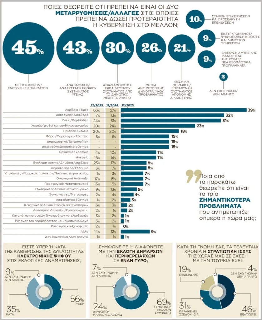 Παράλληλα, οι πολίτες ζητούν από την κυβέρνηση να δώσει έμφαση στη μείωση φόρων και στην ενίσχυση των εισοδημάτων, καθώς και στην αναβάθμιση του Εθνικού Συστήματος Υγείας και στη λήψη μέτρων για το δημογραφικό. Ιδιαίτερα θετική εμφανίζεται η κοινωνία και απέναντι σε μεταρρυθμίσεις όπως η καθιέρωση της ηλεκτρονικής ψήφου και η εκλογή δημάρχων και περιφερειαρχών από τον πρώτο γύρο, προτάσεις που βρίσκονται ψηλά στην κυβερνητική ατζέντα.