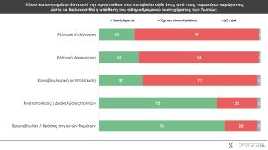 Στο ερώτημα «πόσο ικανοποιημένοι είστε από τις προσπάθειες που καταβάλλει κάθε παράγοντας διαμόρφωσης των εξελίξεων, ώστε να διαλευκανθεί η τραγωδία των Τεμπών», οι πολίτες βαθμολογούν χαμηλά την κυβέρνηση και τη Δικαιοσύνη (77 % και 74 % αντίστοιχα είναι τα ποσοστά όσων δηλώνουν «καθόλου ικανοποιημένοι» και «όχι και τόσο ικανοποιημένοι»). Αρνητική είναι η θέση της κοινής γνώμης και για τα κόμματα της αντιπολίτευσης, με το 31 % των ερωτηθέντων να δηλώνουν «καθόλου ικανοποιημένοι» και το 40% να απαντά «όχι και τόσο ικανοποιημένοι». Η κοινή γνώμη επιδοκιμάζει, πάντως, με μεγάλα ποσοστά τη στάση των συγγενών των θυμάτων (78 % δηλώνουν «πολύ ικανοποιημένοι» και «αρκετά ικανοποιημένοι» για τις πρωτοβουλίες που αναλαμβάνουν),ενώ αντιμετωπίζει πολύ θετικά τις κινητοποιήσεις και τις διαδηλώσεις για τα Τέμπη (73 % είναι συνολικά οι θετικές γνώμες).