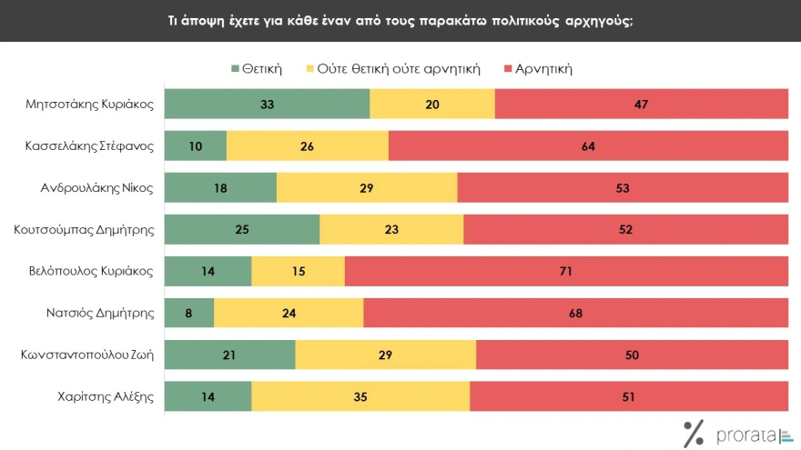 Δημοφιλέστερος πολιτικός αρχηγός είναι ο Κυριάκος Μητσοτάκης με το 33% να διατηρεί θετική γνώμη προς το πρόσωπο του, ενώ ακολουθεί ο Δημήτρης Κουτσούμπας (25%), η Ζωή Κωνσταντοπούλου (21%), ο Νίκος Ανδρουλάκης (18%), ο Κυριάκος Βελόπουλος (14%), ο Αλέξης Χαρίτσης (14%), ο Στέφανος Κασσελάκης (10%) και τέλος ο Δημήτρης Νατσιός (8%).