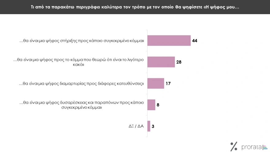 Παράλληλα, το 44% δηλώνει ότι στις επικείμενες ευρωεκλογές θα ψηφίσει για να δηλώσει την υποστήριξη του προς κάποιο συγκεκριμένο κόμμα, το 28% πως θα ψηφίσει το κόμμα που θεωρεί πως αποτελεί το «λιγότερο κακό», το 8% ότι θα ψηφίσει εκφράζοντας δυσαρέσκεια και παράπονα προς κάποιο συγκεκριμένο κόμμα, ενώ το 17% πως θα ψηφίσει, διαμαρτυρόμενο προς διάφορες κατευθύνσεις.