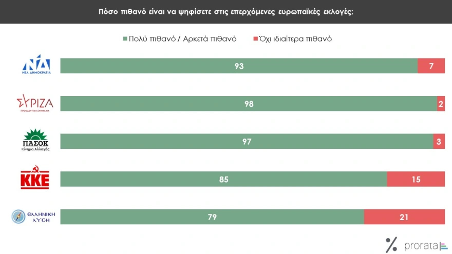 Τέλος, καταγράφεται ισχυρή αβεβαιότητα και ως προς την συμμετοχή στις επικείμενες ευρωεκλογές αλλά και ως προς την δηλωθείσα εκλογική προτίμηση. Πιο συγκεκριμένα, μόλις το 66% δηλώνει ότι είναι πολύ πιθανό να ψηφίσει στις ευρωεκλογές, ενώ την ίδια στιγμή το 23.1% όσων θα προσέλθουν σε αυτές, είτε δηλώνει αναποφάσιστο (11.5%), είτε αβεβαιότητα για την δηλωθείσα πρόθεση ψήφου (11.6%).