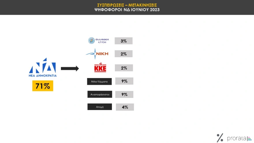 Ως προς τις συσπειρώσεις των πολιτικών κομμάτων και τις βασικές μετακινήσεις ψηφοφόρων σε σχέση με τις βουλευτικές εκλογές του Ιουνίου, η ΝΔ εκτιμάται ότι θα στηριχθεί εκ νέου από το 71% της εκλογικής της βάσης, σημειώνοντας ορισμένες απώλειες κυρίως προς την Ελληνική Λύση και τη Νίκη.