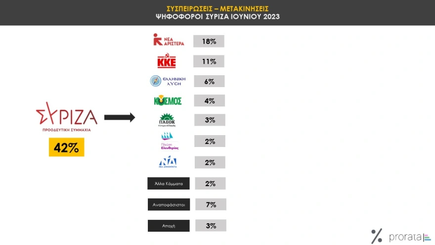 Η αντίστοιχη συσπείρωση του ΣΥΡΙΖΑ-ΠΣ εκτιμάται στο 42%, με το κόμμα της αξιωματικής αντιπολίτευσης να καταγράφει τις μεγαλύτερες απώλειες προηγούμενων εκλογέων του προς τη Νέα Αριστερά, το ΚΚΕ, την Ελληνική Λύση και τον Κόσμο.