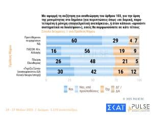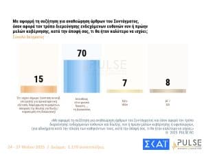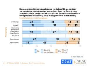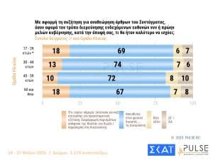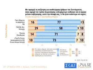 Σε αυτή την έρευνα, οι ψηφοφόροι εμφανίζονται θετικοί στην άρση της μονιμότητας στο Δημόσιο, “υπό προϋποθέσεις” που σχετίζονται με την απόδοση των δημοσίων υπαλλήλων. Παράλληλα, καταγράφεται διακομματική αποδοχή υπέρ της “παράκαμψης” των προανακριτικών επιτροπών της Βουλής και της διερεύνησης ποινικών ευθυνών στους υπουργούς από τον φυσικό δικαστή τους.