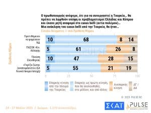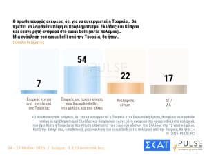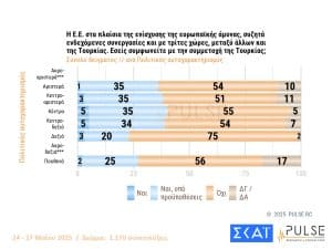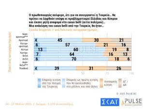 Όσον αφορά τη συμμετοχή της Τουρκίας στην κοινή ευρωπαϊκή άμυνα, το 56% διαφωνεί. Ωστόσο, ένας στους τρεις λέει “ναι, υπό προϋποθέσεις”. Επιπλέον, το 54% εκτιμά ότι η άρση του casus belli από την Άγκυρα θα ήταν ένα επαρκές “πρώτο βήμα που θα ακολουθηθεί από άλλες κινήσεις”.