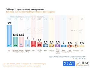 Στις 15,5 μονάδες καταγράφεται το προβάδισμα της Νέας Δημοκρατίας στην εκτίμηση ψήφου, σύμφωνα με τη μέτρηση της Pulse που παρουσιάστηκε στο κεντρικό δελτίο του Σκάι. Το ποσοστό αυτό είναι μισή μονάδα πάνω σε σχέση με τον Απρίλιο, με τη Νέα Δημοκρατία να βρίσκεται στο 29%, δηλαδή πάνω από το ποσοστό των ευρωεκλογών.