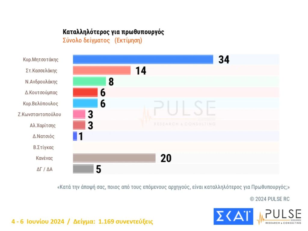 Όσον αφορά στον καταλληλότερο πολιτικό αρχηγό για πρωθυπουργό, στην πρώτη θέση βρίσκεται με διαφορά ο Κυριάκος Μητσοτάκης, ενώ στη δεύτερη θέση βρίσκεται ουσιαστικά ο… κανένας και τρίτος ο Στέφανος Κασσελάκης.
