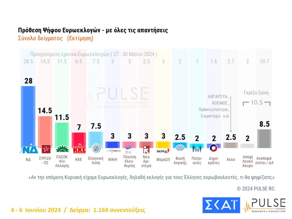 Σύμφωνα με τη δημοσκόπηση της Pulse αναφορικά με την πρόθεση ψήφου τα ποσοστά των κομμάτων είναι: