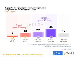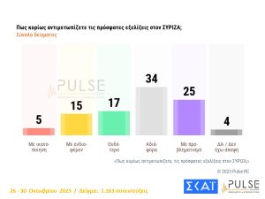 Απόλυτη κυριαρχία της Νέας Δημοκρατίας στο πολιτικό σκηνικό της χώρας δείχνει και η αποψινή δημοσκόπηση της PULSE που παρουσιάστηκε στο κεντρικό δελτίο ειδήσεων του ΣΚΑΙ. Η ΝΔ προηγείται στην πρόθεση ψήφου με 38,5% κι ακολουθεί ο ΣΥΡΙΖΑ με 17%. Tο ΠΑΣΟΚ είναι τρίτο με 13.5% ,το ΚΚΕ με 9.5, Ελληνική Λύση 5,5%, Σπαρτιάτες 3,5%, Νίκη 3,5%. Πλεύση Ελευθερίας 3%, ΜΕΡΑ 25 3%.