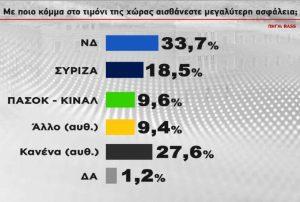 Στο ερώτημα «με ποιο κόμμα στο τιμόνι της χώρας αισθάνεστε μεγαλύτερη ασφάλεια το 33,7% λέει με τη ΝΔ, το 18,5% με τον ΣΥΡΙΖΑ, το 9,6% με το ΠΑΣΟΚ αλλά και το 27,6% με… κανένα.