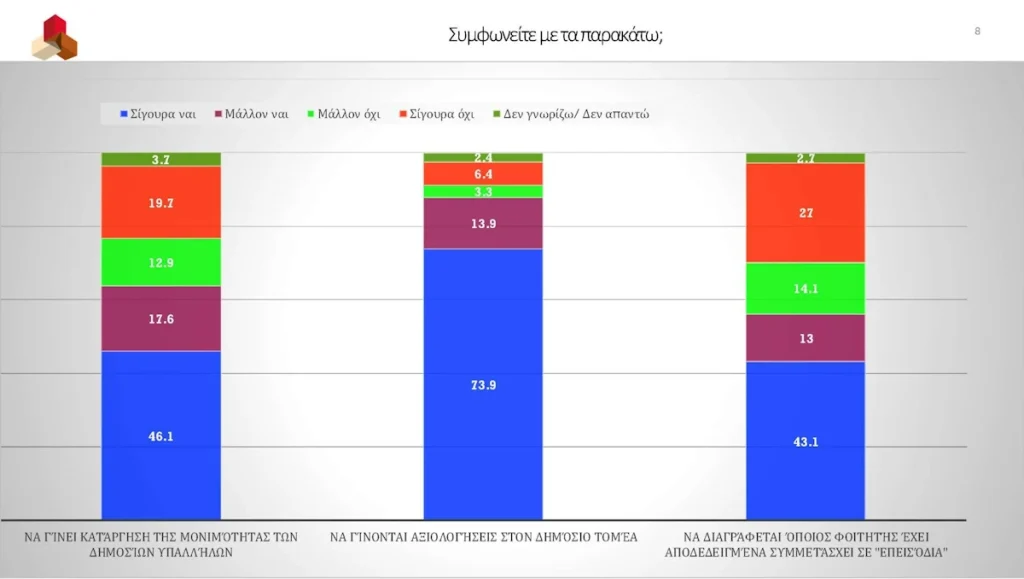 Συγκριτικά χαμηλότερα –αν και πλειοψηφικά, στο 56,1%– είναι τα ποσοστά εκείνων που συμφωνούν με τη διαγραφή των φοιτητών που αποδεδειγμένα συμμετέχουν σε «επεισόδια» (ωστόσο υπάρχει ένα ισχυρό 27% που διαφωνεί κάθετα και συνολικά ένα 41,1% που διαφωνεί).