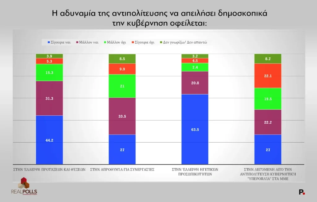 Η αδυναμία της αντιπολίτευσης να απειλήσει δημοσκοπικά την κυβερνητική παράταξη αποδίδεται από τους πολίτες στην έλλειψη ηγετικών προσωπικοτήτων (84% (Σίγουρα Ναι / Μάλλον Ναι), στην έλλειψη προτάσεων και θέσεων (75,5%), στην απροθυμία για συνεργασία (60,5%) και μόνο σε ποσοστό 50% στην καταγγελλόμενη «υπεροπλία» της κυβέρνησης στα ΜΜΕ.