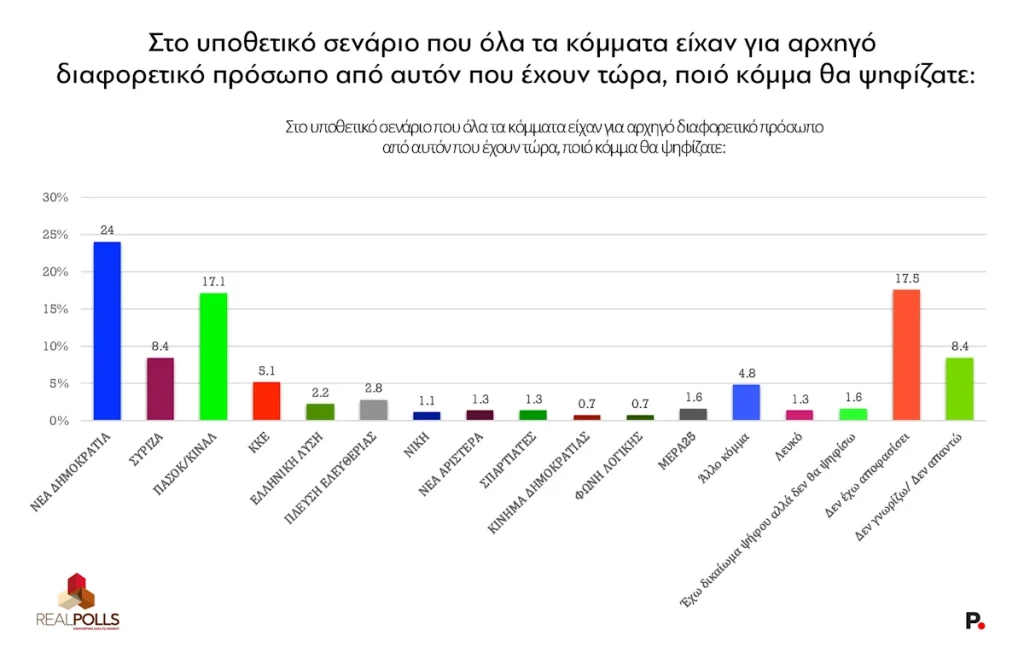 Είναι χαρακτηριστικό πως στο υποθετικό σενάριο που τα κόμματα κατεβαίνουν στις εθνικές εκλογές με διαφορετικούς αρχηγούς απ’ ό,τι τώρα, το ΠΑΣΟΚ εκτοξεύει τα ποσοστά του στο 17,1%. Στον αντίποδα η Νέα Δημοκρατία χωρίς τον Κυριάκο Μητσοτάκη υποχωρεί στο 24%.